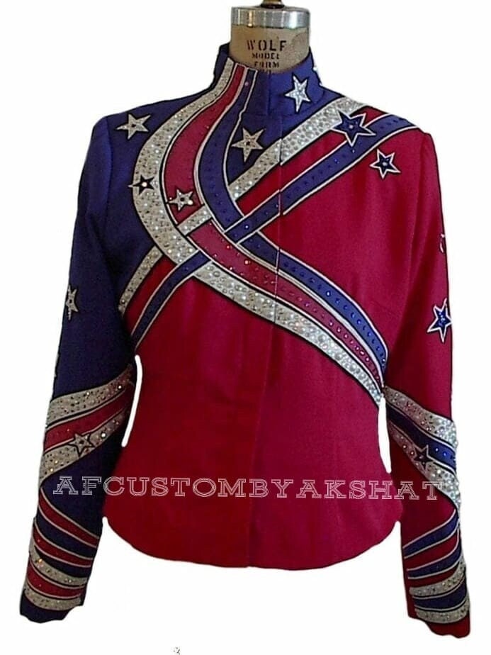 Now Ride with more colors:- Silver / Blue with Red base Showmanship, Horsemanship, Western pleasure Rodeo Queen Jackets For Sale.