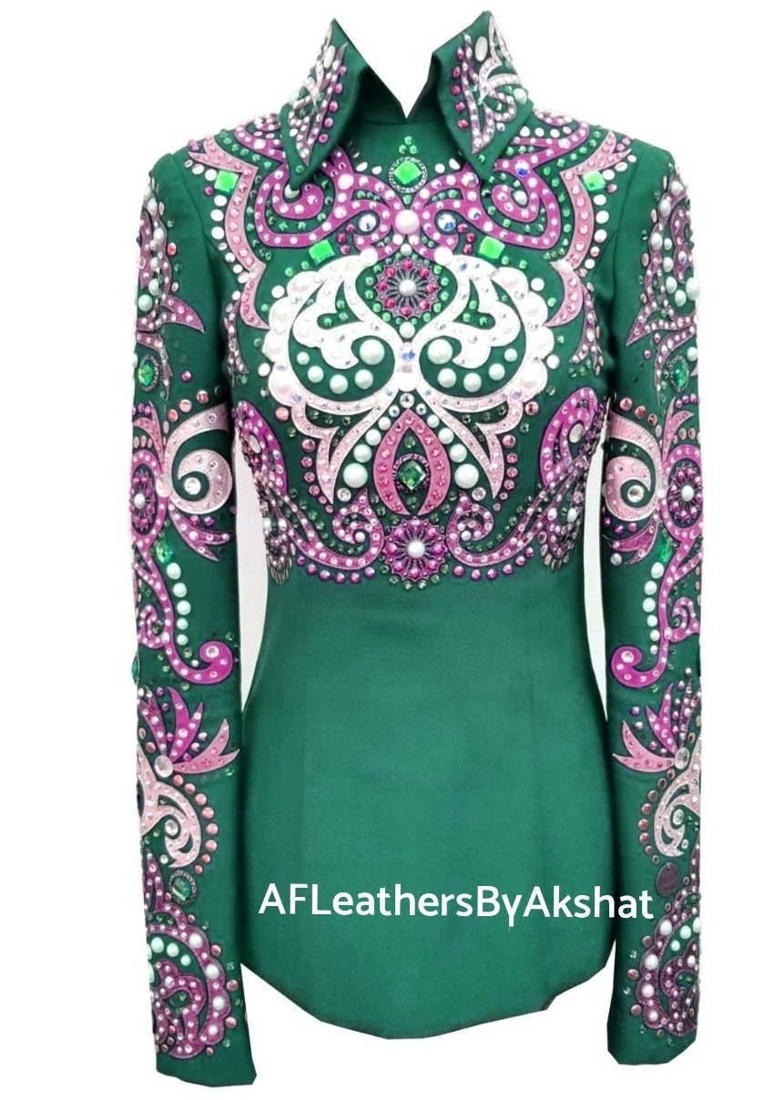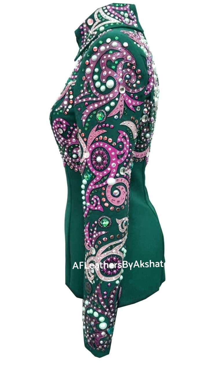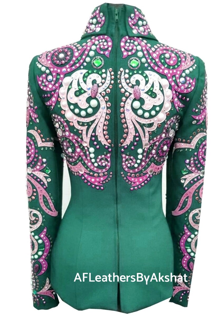Now Ride with more colors:- Silver with Green base Showmanship, Horsemanship, Western pleasure Rodeo Queen Jackets For Sale.