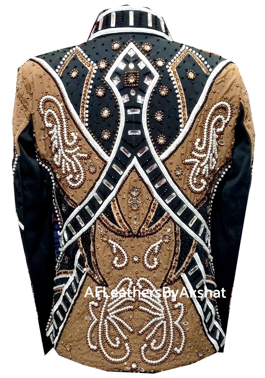 Now Ride with more colors:- White/Black with Brown base Showmanship, Horsemanship, Western pleasure Rodeo Queen Jackets For Sale.