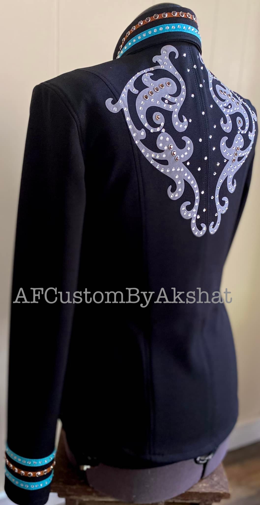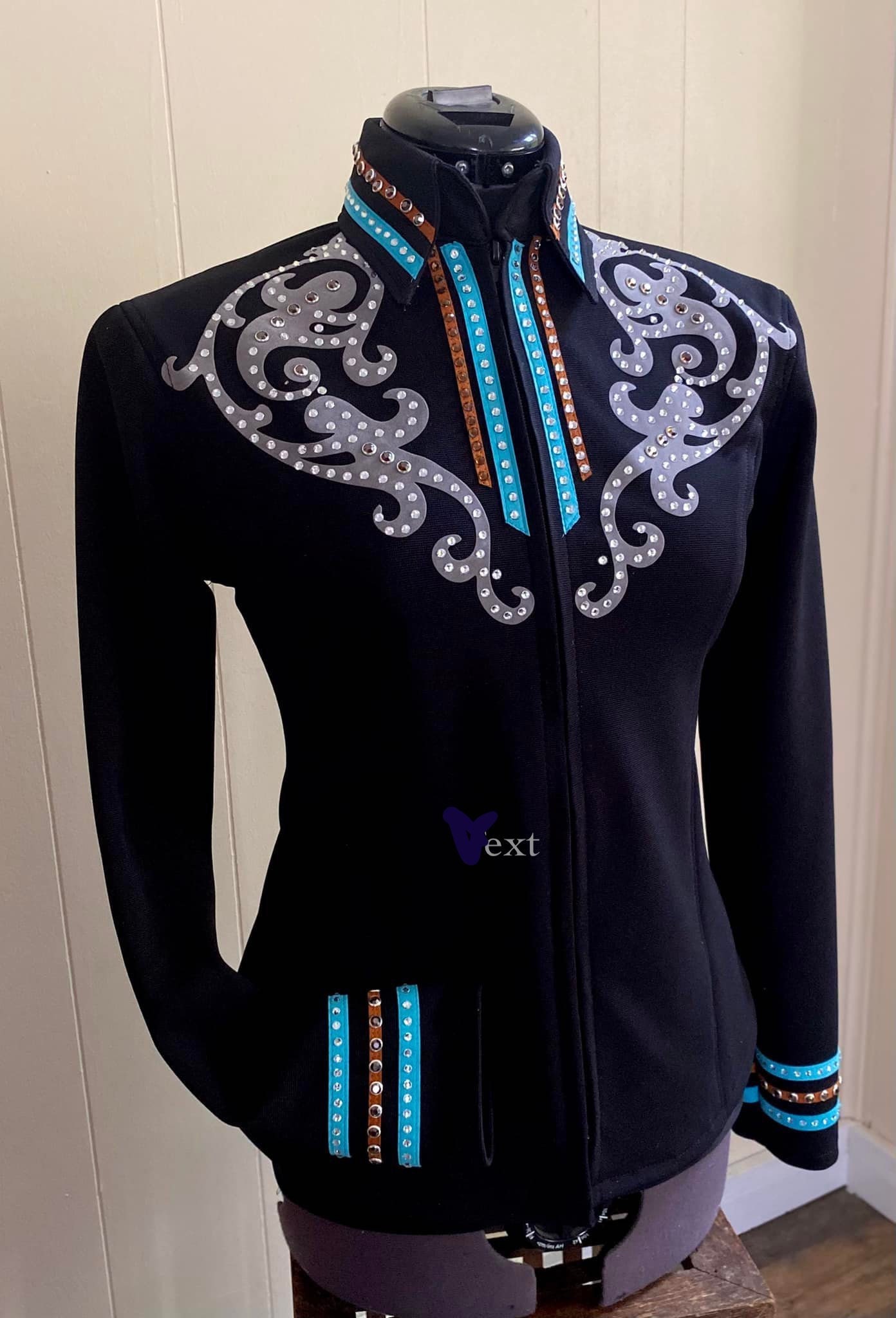 Now Ride with more colors:- Silver/ Sky Blue with Black base Showmanship, Horsemanship, Western pleasure Rodeo Queen Jackets For Sale.
