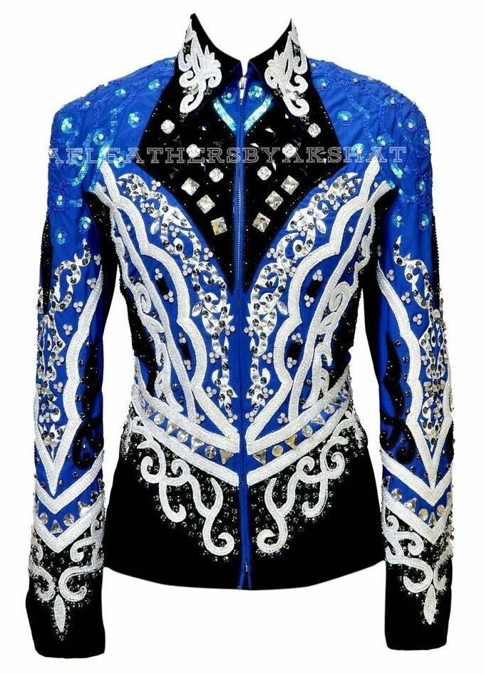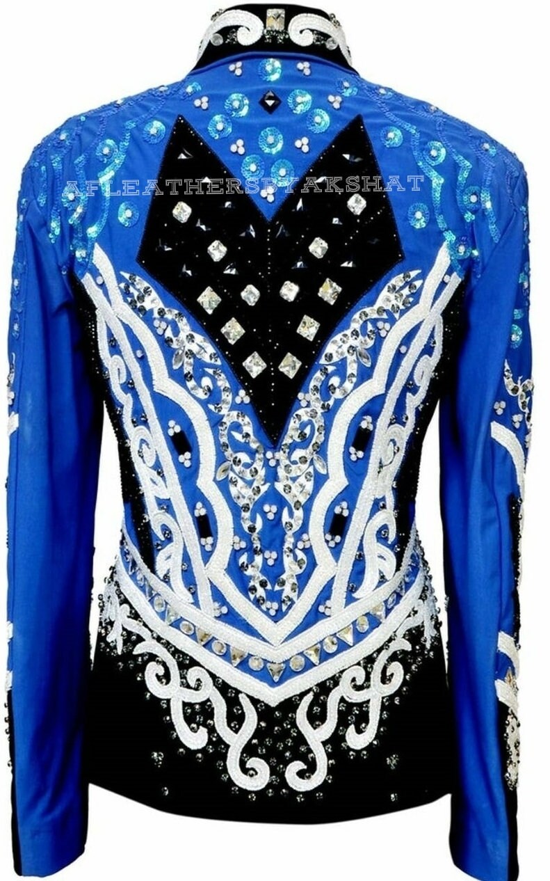 Now Ride with more colors:- White/ Silver/ Blue with Black base Showmanship, Horsemanship, Western pleasure Rodeo Queen Jackets For Sale.