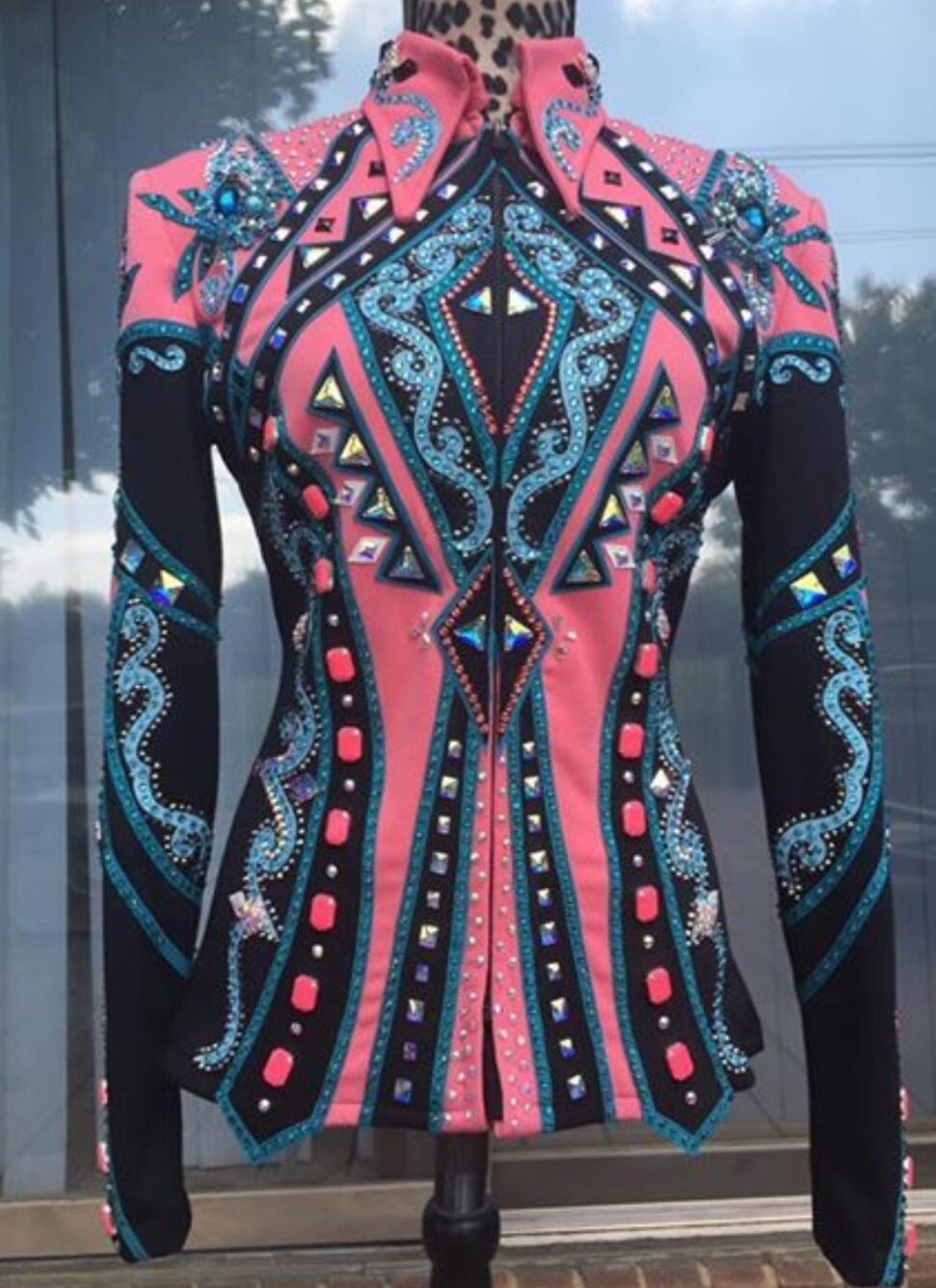 Now Ride with more colors:- Silver/ sky blue /pink with Black base Showmanship, Horsemanship, Western pleasure Rodeo Queen Jackets For Sale.