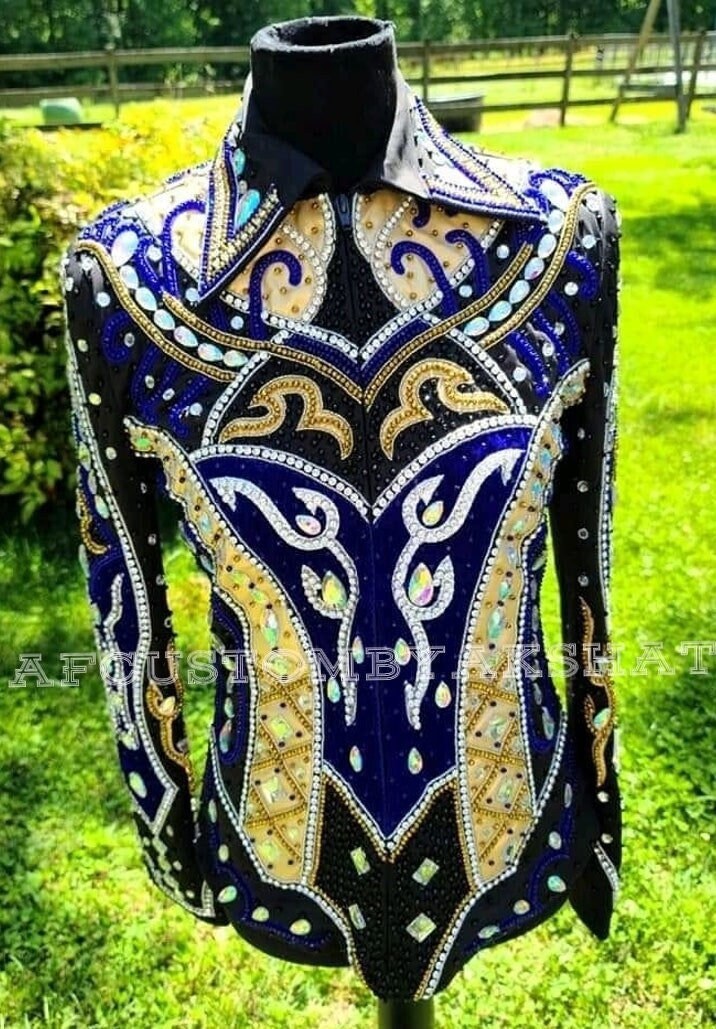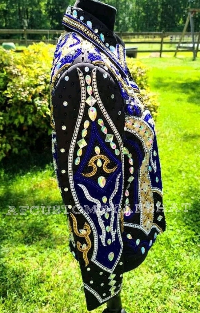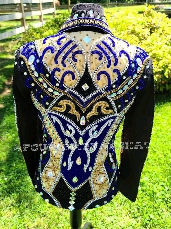 Now Ride with more colors:- Blue/ Gold with Black base Showmanship, Horsemanship, Western pleasure Rodeo Queen Jackets For Sale.