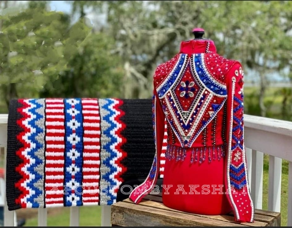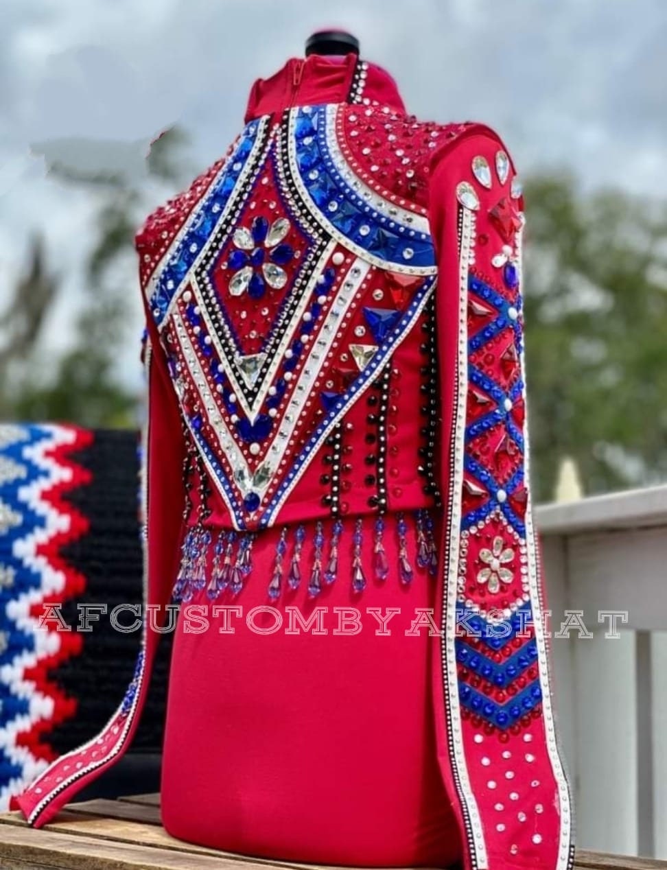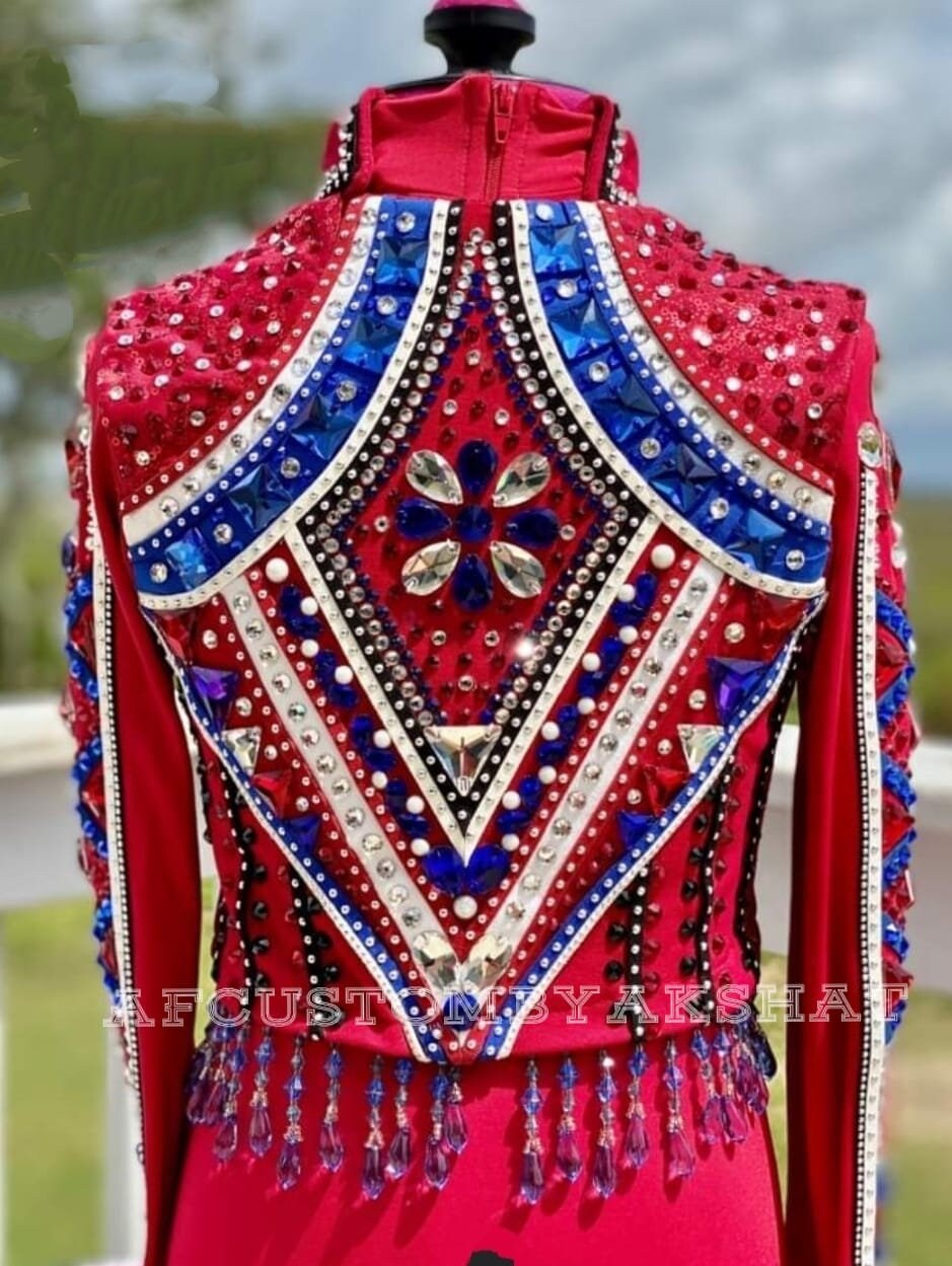 Now Ride with more colors:- Silver/Blue with Red base Showmanship, Horsemanship, Western pleasure Rodeo Queen Jackets For Sale.
