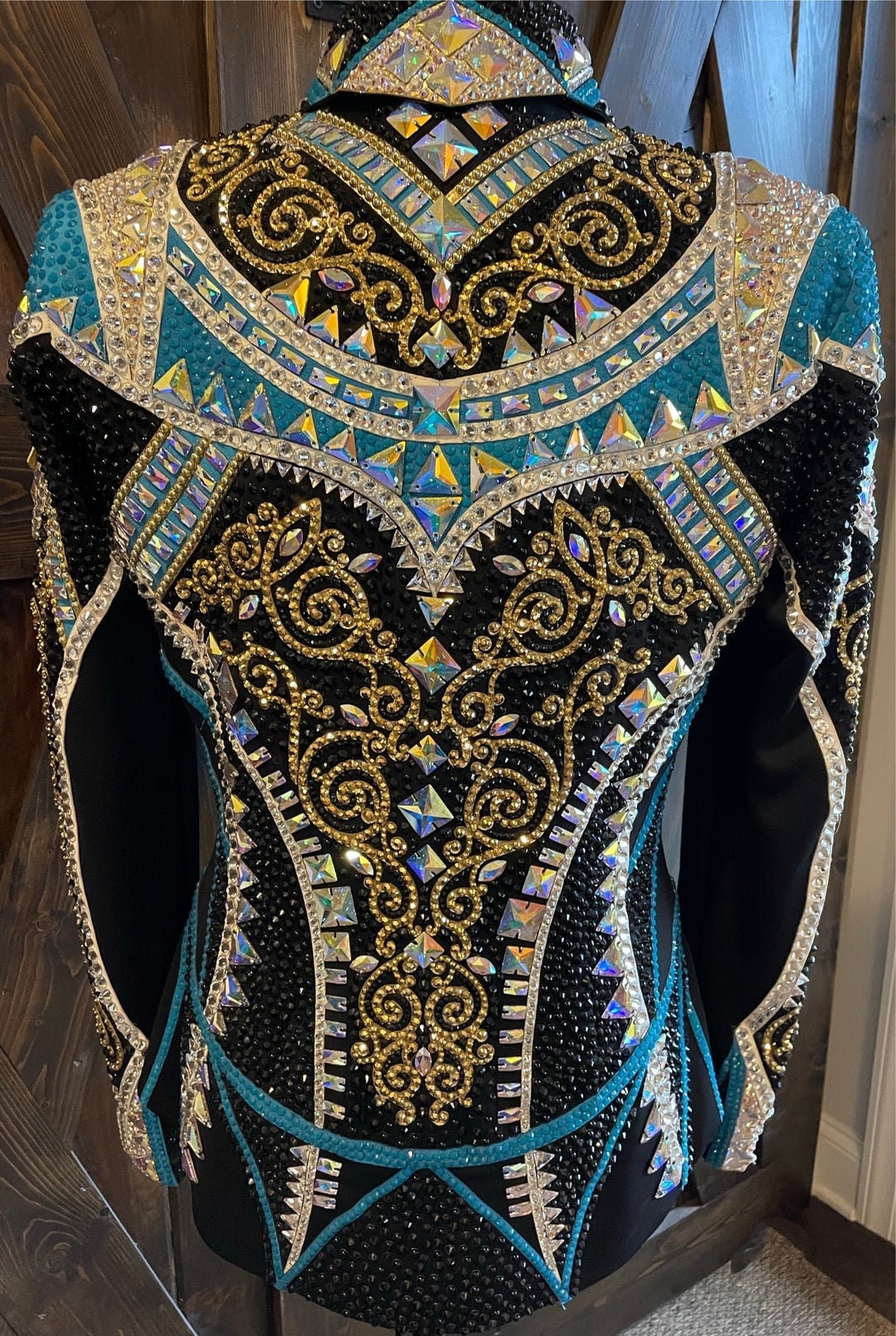 Now Ride with more colors:- sky blue/ gold with Black base Showmanship, Horsemanship, Western pleasure Rodeo Queen Jackets For Sale.