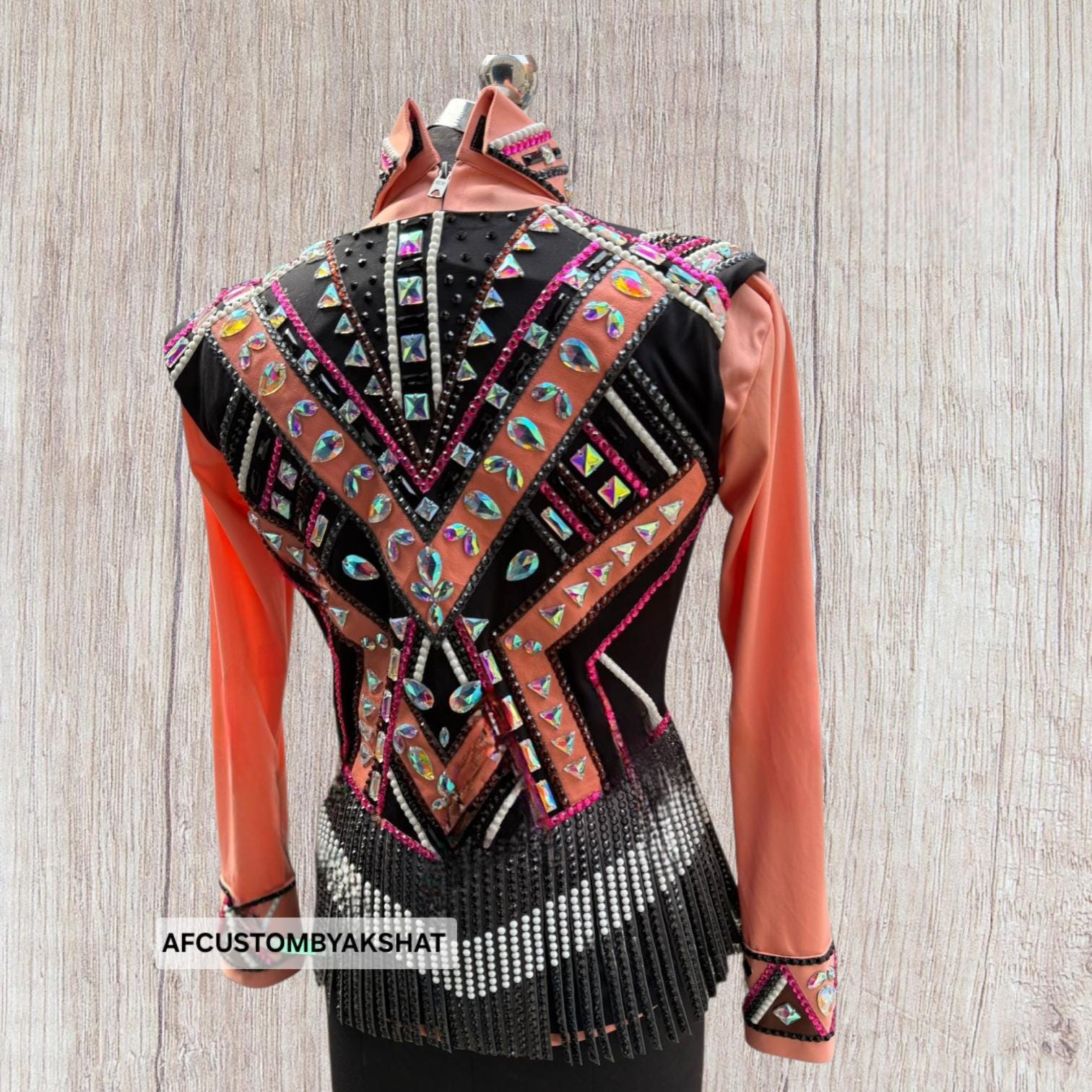 This professional-grade performance top from AFCUSTOMS features a striking peach and black contrast, meticulously hand-embellished to ensure you catch the judge's eye from every angle.