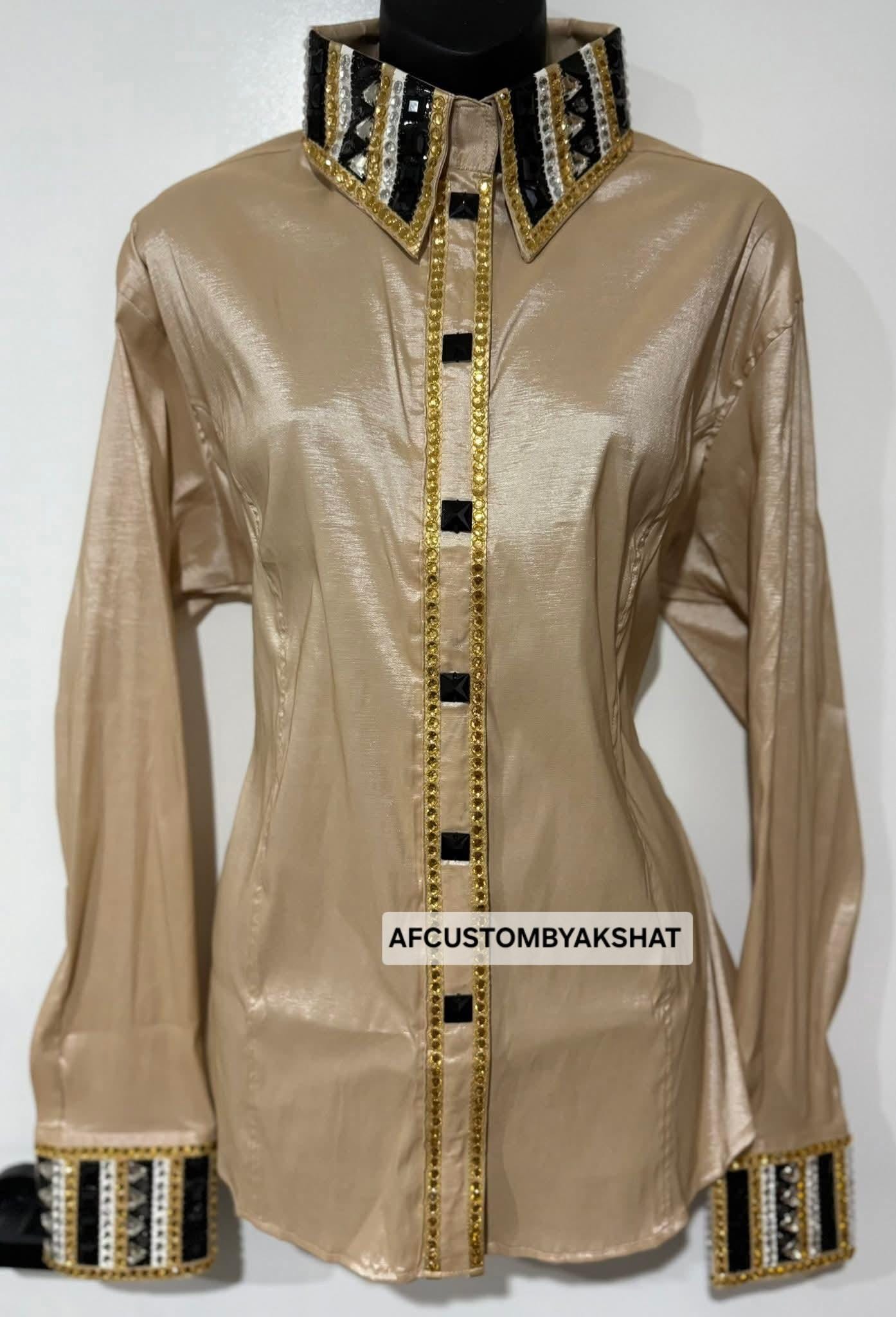 Command the center of the ring with the elite elegance of "The Golden Hour" Western Show Set. This perfectly coordinated outfit pairs a luxurious champagne-toned show shirt with a premium, heavy-weight gold and black wool saddle blanket. It is designed for the serious competitor who wants a sophisticated, high-end presence that catches the judge's eye from across the pen.
