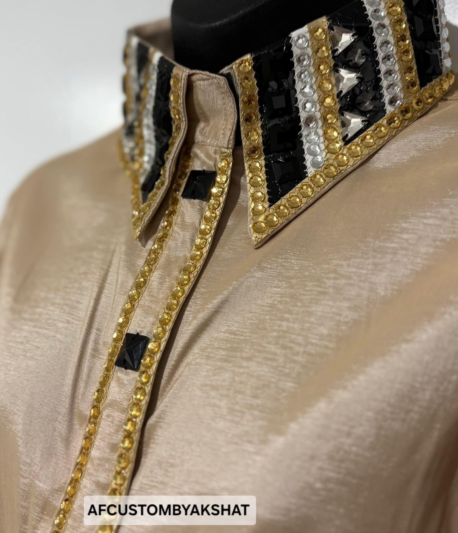 Details: heavy crystal embellishment featuring black square stones, silver triangles, and rose of golden rhinestones on the collar cuffs and placket.